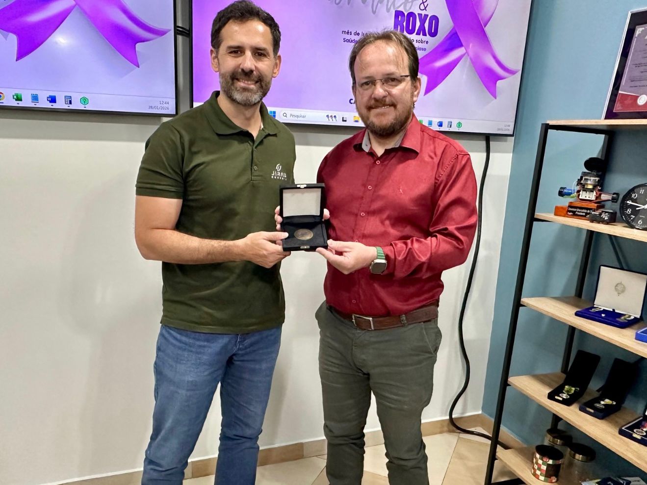 O diretor Rodolfo Torres entregou brindes institucionais e na ocasião, o presidente da CAERD agraciou os representantes com a Moeda Institucional – Grau Bronze, em reconhecimento à parceria, ao envolvimento institucional e à contribuição da empresa para o saneamento em Rondônia.