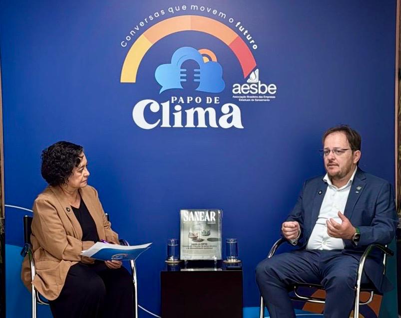 Entrevistado por Patrícia Duarte, Brancalhão destacou desafios climáticos e soluções para garantir segurança hídrica (Foto: Produção Aesbe)